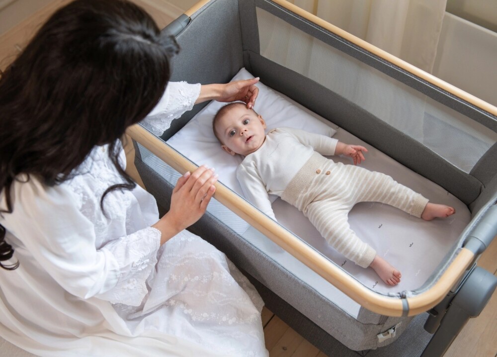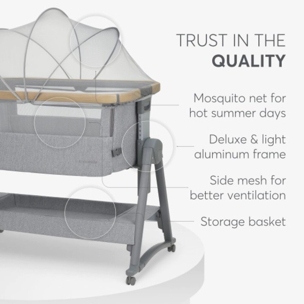 La parte frontal se baja para un acceso sin esfuerzo durante la noche, mientras que la correa de seguridad incluida asegura la cuna a su cama para mayor estabilidad.