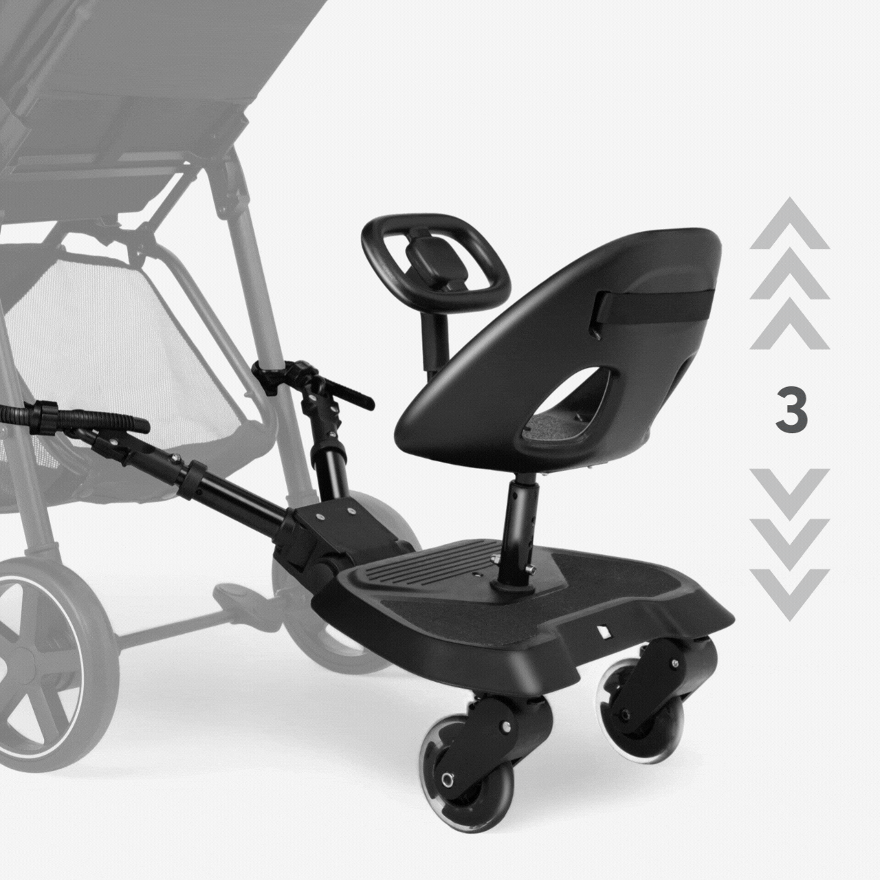 La tabla del cochecito cuenta con adaptadores de longitud y altura ajustables y una altura de asiento ajustable, lo que garantiza que se pueda adaptar perfectamente a su cochecito y brindar comodidad a su hijo, independientemente del tamaño o el tipo de cochecito.